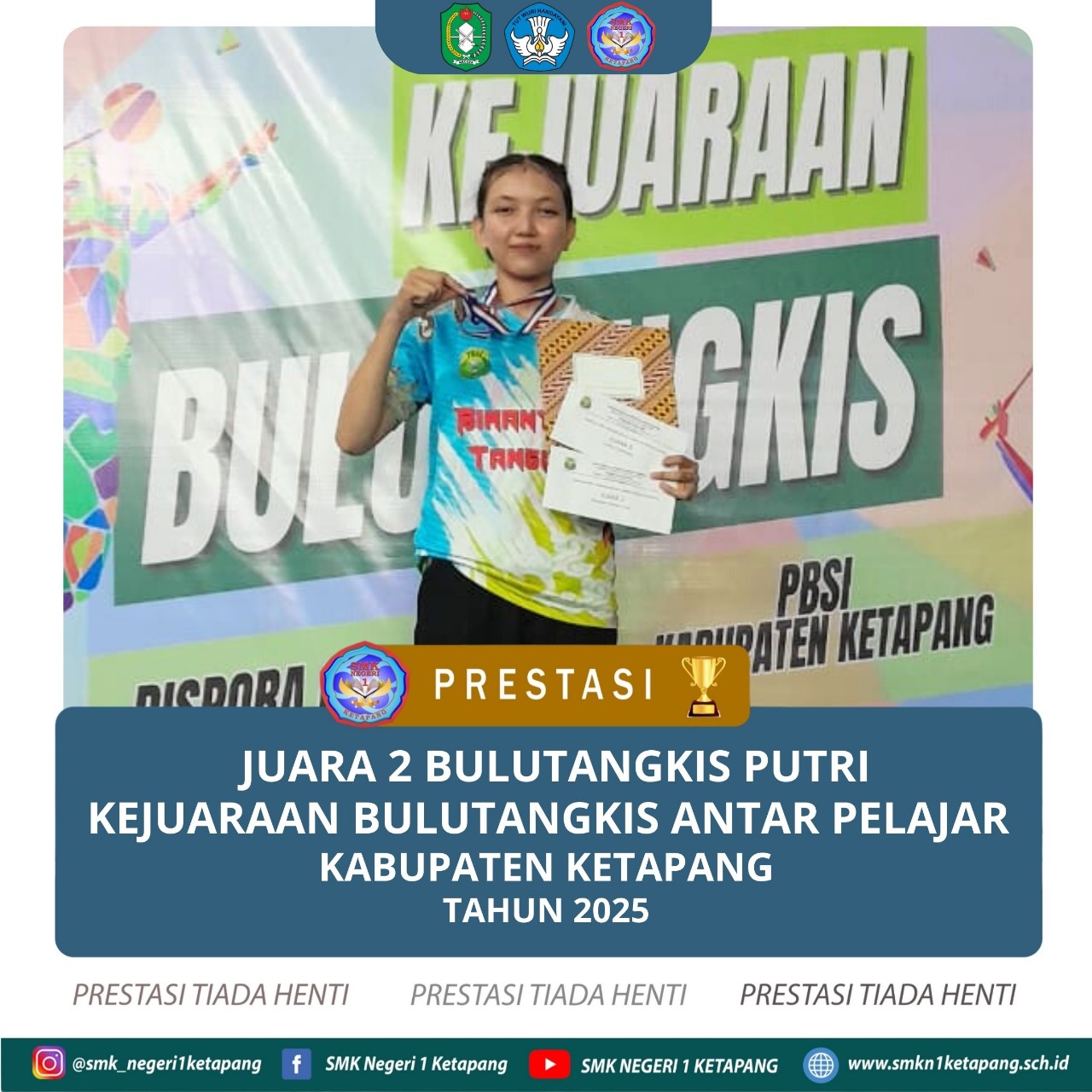 Ketapang — Prestasi membanggakan kembali ditorehkan oleh siswi SMK Negeri 1 Ketapang. Fitria, siswi kelas 11 jurusan Perhotelan, berhasil meraih Juara 2 dalam ajang bergengsi Kejuaraan Bulu Tangkis Dispora Open 2025 yang diselenggarakan oleh Dinas Pemuda dan Olahraga (Dispora) bekerja sama dengan PBSI Ketapang.